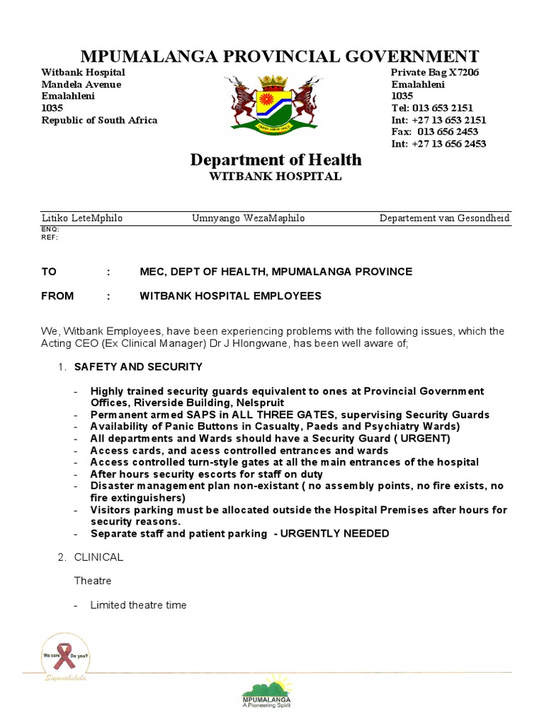 A List Of Concerns To The Mpumalanga Department Of Health Hospital Nursing